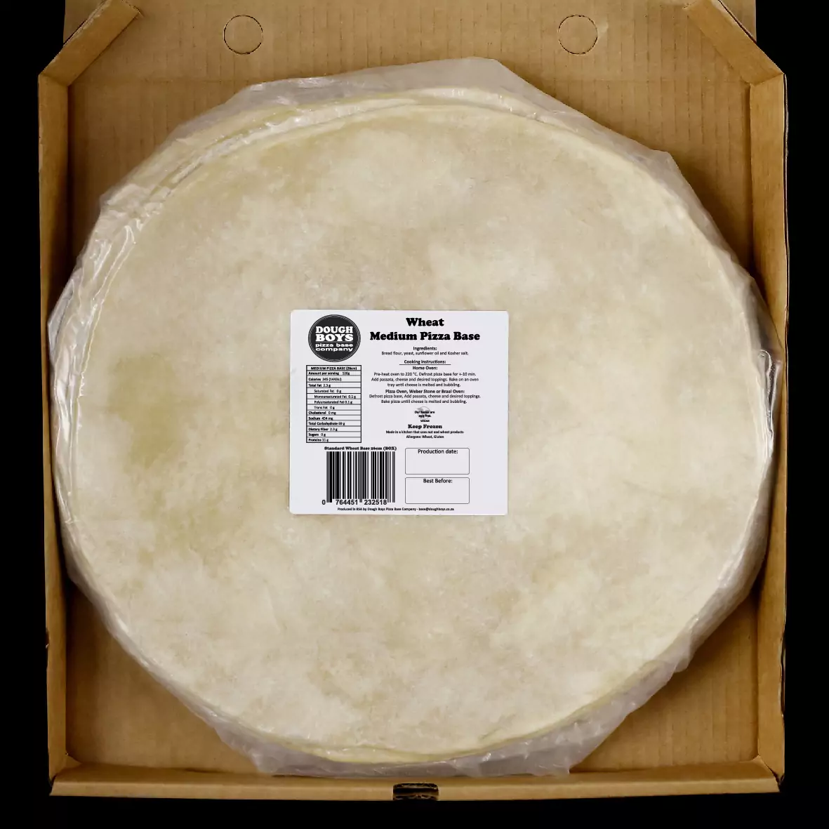 Four 21 cm standard wheat pizza bases, hand‑rolled, par‑cooked and frozen – perfectly portioned for children’s meals or light personal pizzas. These ready-to-top bases offer convenience without sacrificing texture or dough quality.