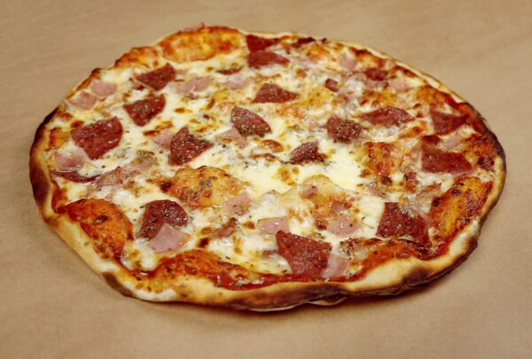 A robust pizza loaded with ham, bacon and salami for a richly savoury, meat-forward flavour that satisfies hearty appetites. These cured meats combine to deliver smoky, salty depth in every slice.