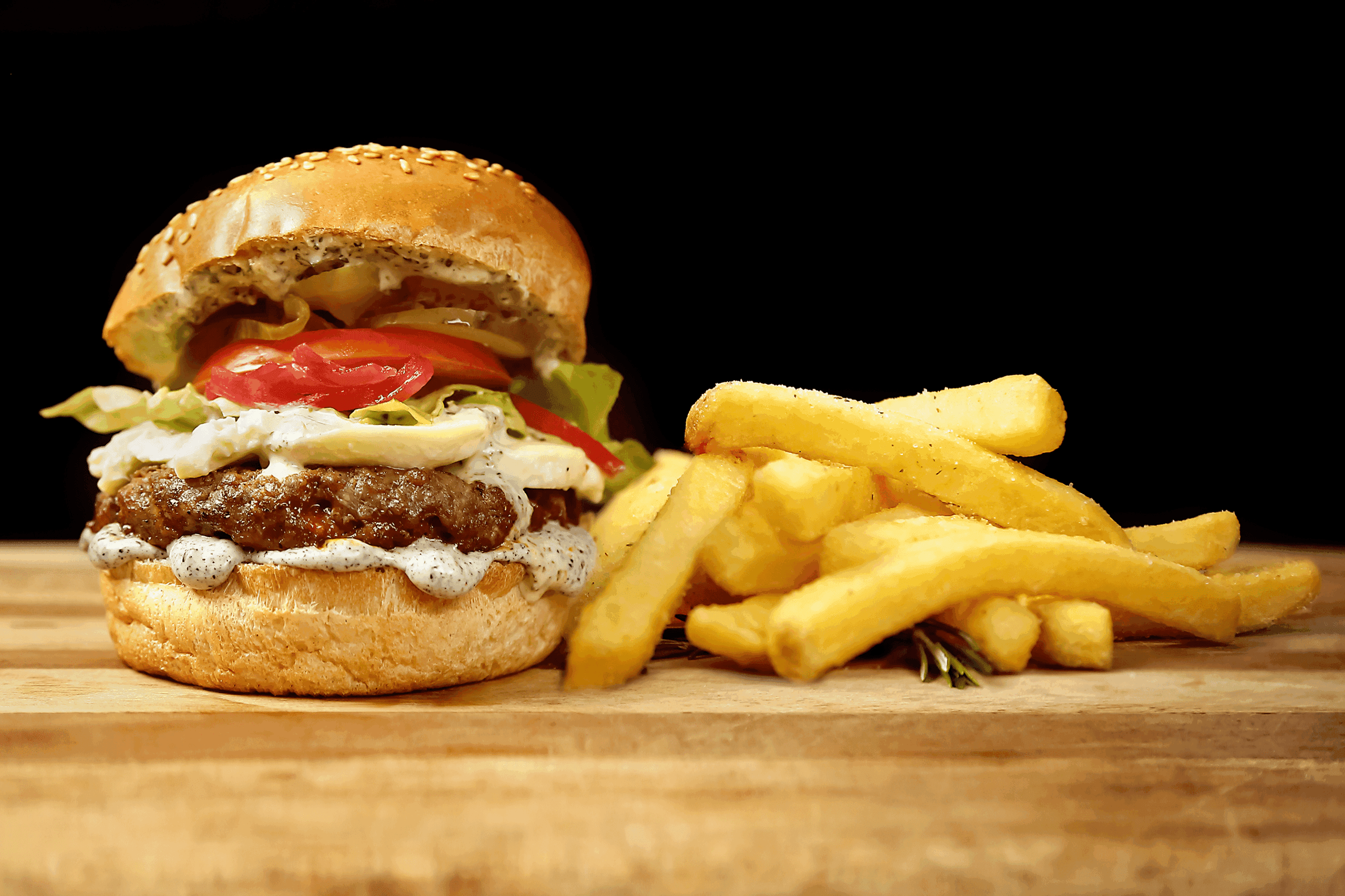 An Argentinean-inspired beef patty with smoky charcoal mayonnaise, creamy fior di latte mozzarella, and zesty chimichurri sauce, finished with pickled red onions–an enticing fusion of wood-fired smokiness and vibrant South American zest.