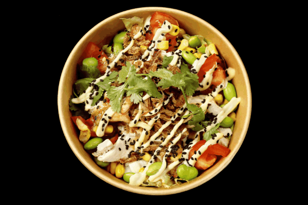 Grilled free-range chicken, edamame beans, corn, cherry tomatoes, cucumber, coriander with black sesame seeds, topped with kewpie mayo and a chilli, garlic, ginger & soy dressing on a crisp lettuce & cabbage salad base.