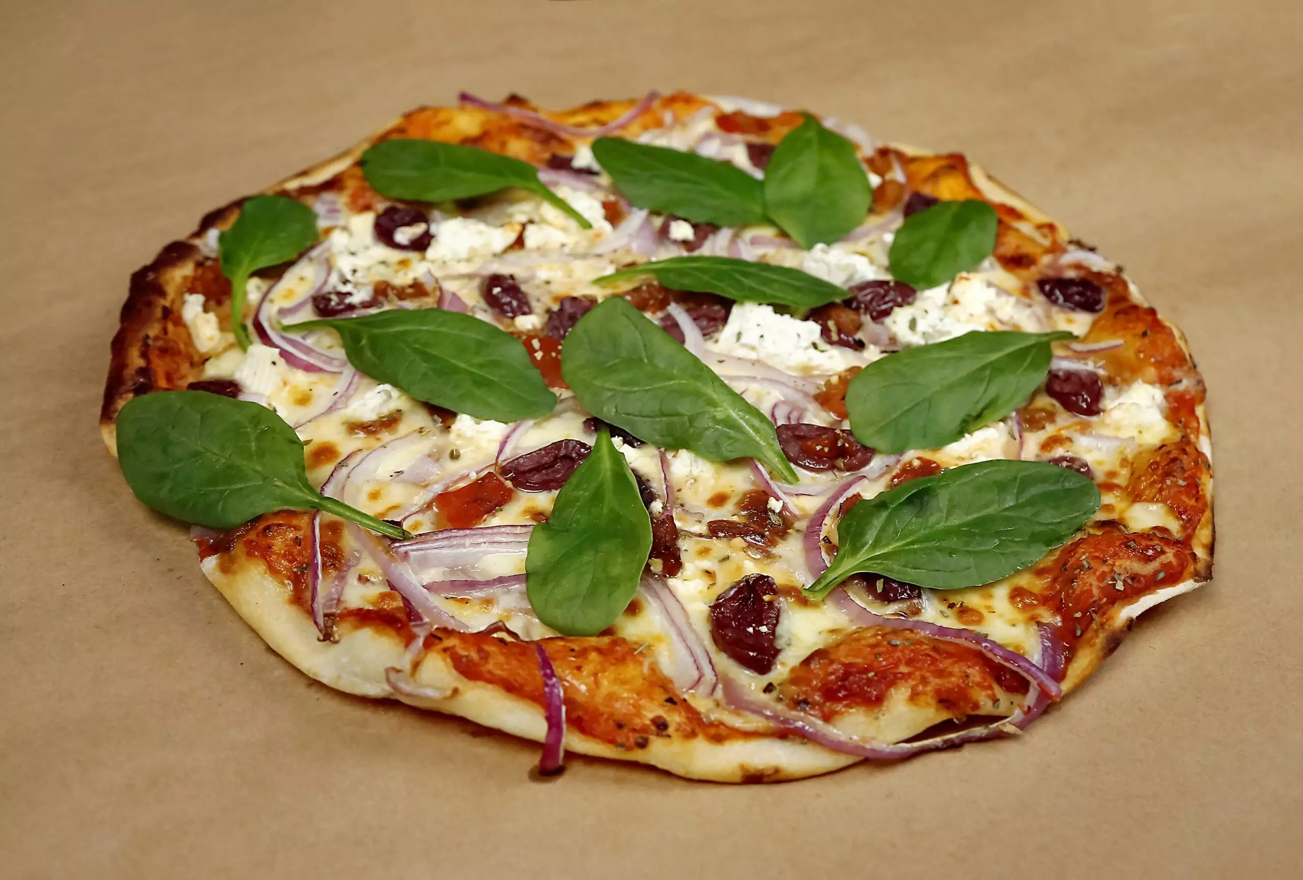 Baby spinach, feta, olives, roasted red pepper and onion combine for a vibrant, Mediterranean-inspired pizza that layers earthy greens with briny and roasted-sweet accents