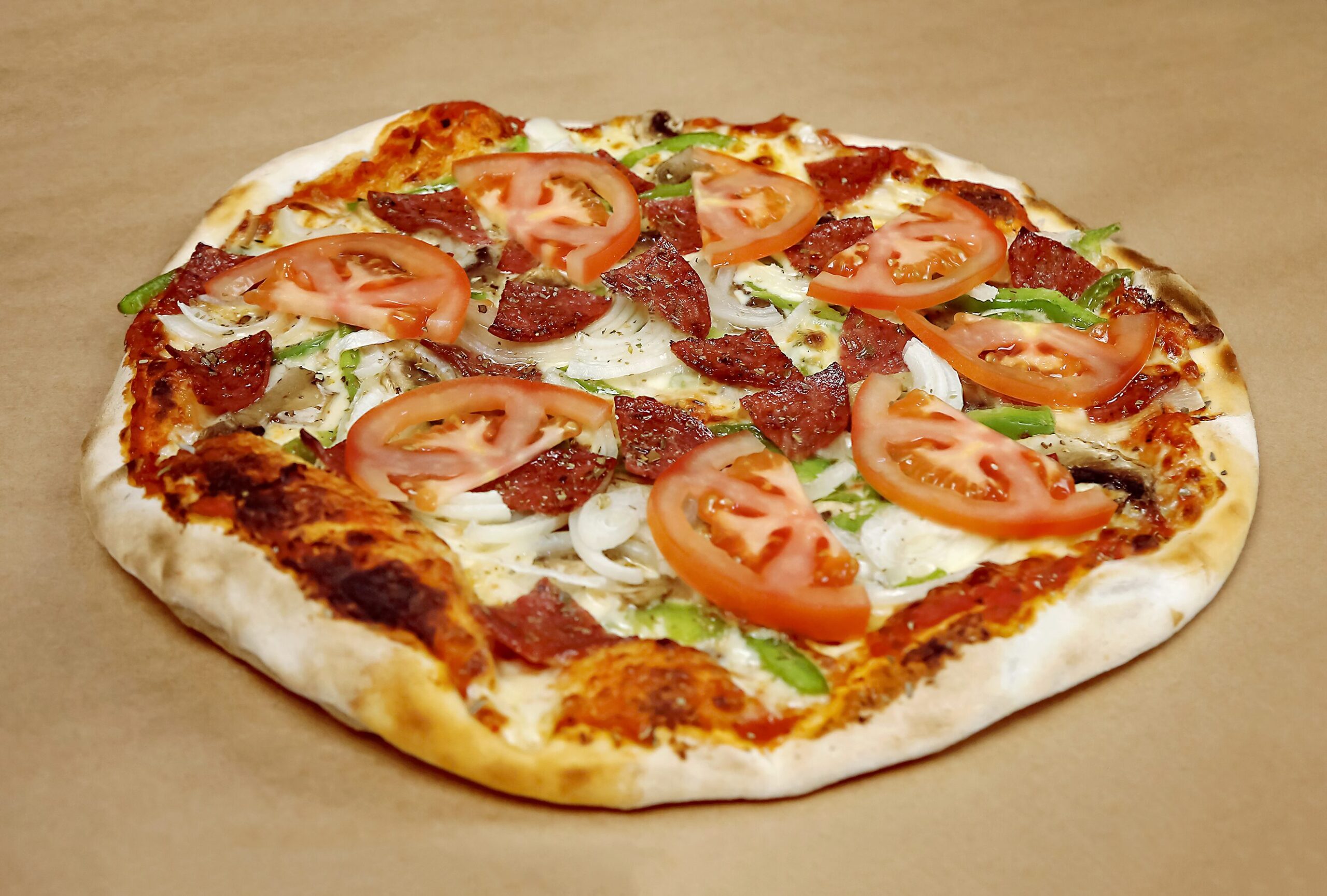 Salami, mushrooms, onions, green pepper and fresh tomato come together on a classic pizza base for a dynamic medley of savoury, earthy and fresh flavours.
