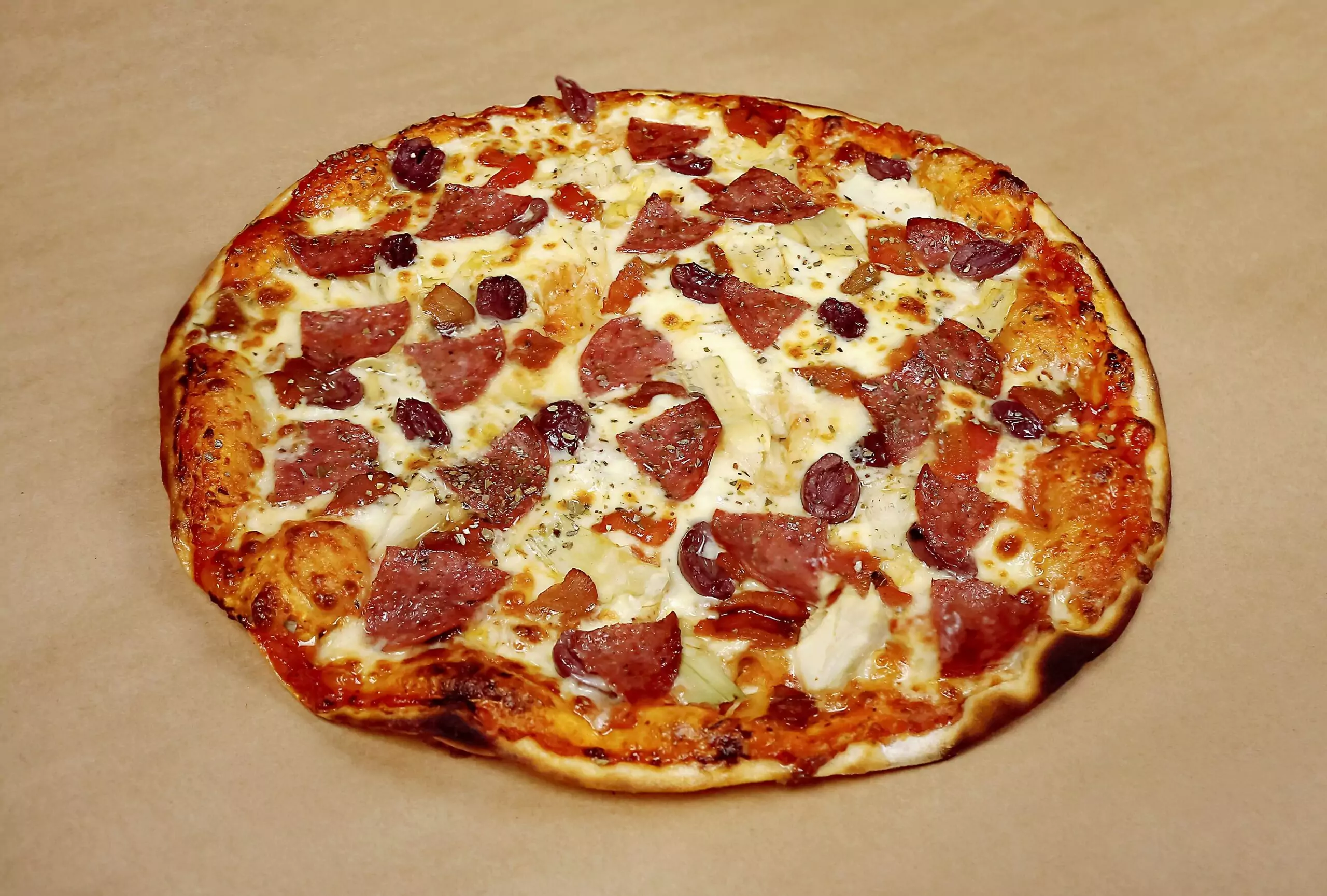A wood-fired thin-crust pizza featuring a tomato base, mozzarella, salami, artichokes, roasted red peppers, and olives. The Mediterranean Pizza brings a sophisticated, balanced flavour with every slice – a tasteful tribute to classic ingredients.