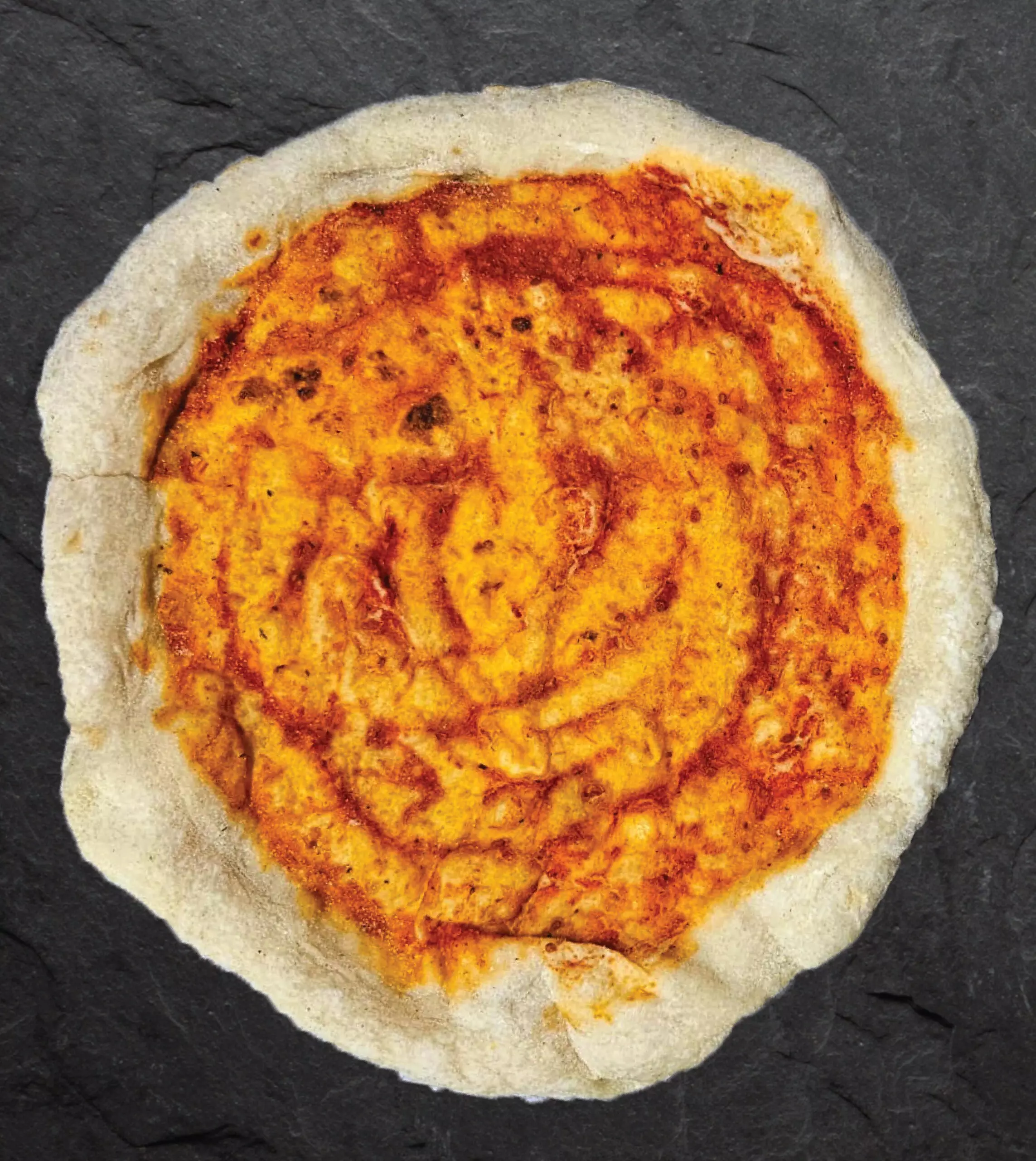 A pair of 48-hour fermented Neapolitan pizza bases, hand-stretched and par-cooked in a wood-fired oven, topped with Italian tomato and frozen for convenience – ideal for creating authentic, fast wood-fired pizzas at home.