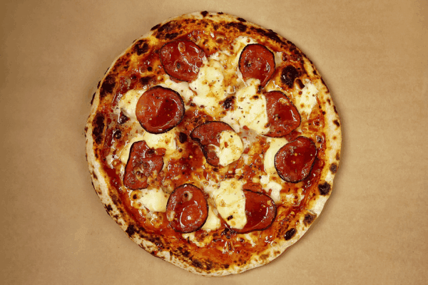 A Neapolitan-style Margherita with Italian tomato base and fior di latte mozzarella, topped with locally made pepperoni and a drizzle of garlic & red chilli honey for a sweet-heat punch.