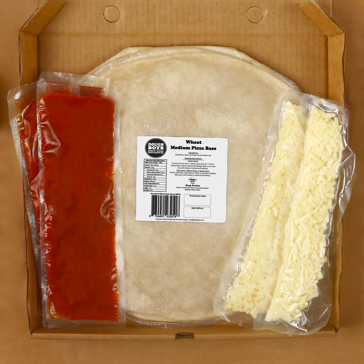 DIY pizza kit featuring four medium wheat-based pizza crusts, tomato sauce and mozzarella – everything required to bake four 26 cm Margherita-style pizzas at home. Ideal for satisfying pizza nights with ease and reliability.