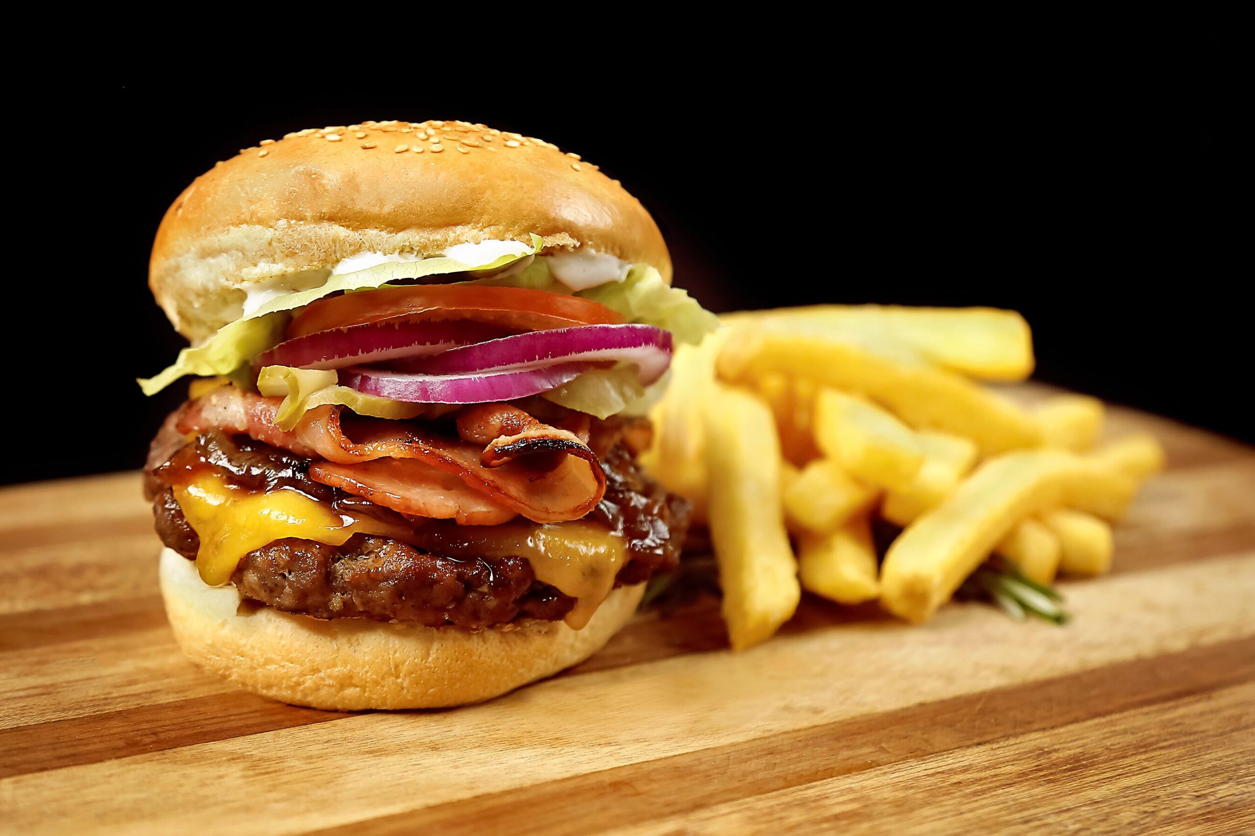A beef patty topped with cheddar cheese, balsamic onions, streaky bacon, lettuce, tomato, pickle and onion – rich, indulgent and designed to cure even the toughest morning.