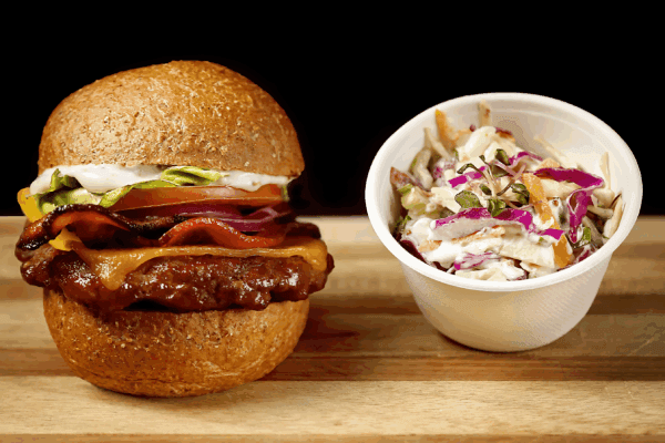A beef patty, streaky bacon, cheddar cheese, mustard mayo, lettuce, tomato, and onion garnish on a low-carb burger roll, served with American slaw – a satisfying, low-carb option that delivers all the flavour without the guilt.